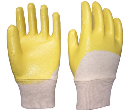 DESCRIPTION: Interlock liner knitted wrist yellow nitrile coated open back FEATURES: Heavy weight nitrile coating for abrasion and puncture resistance Excellent durability and outstanding performance in oily and greasy environments Cotton liner provides exceptional comfort for wearer APPLICATION: Warehousing Assembling Construction Gardening and farming